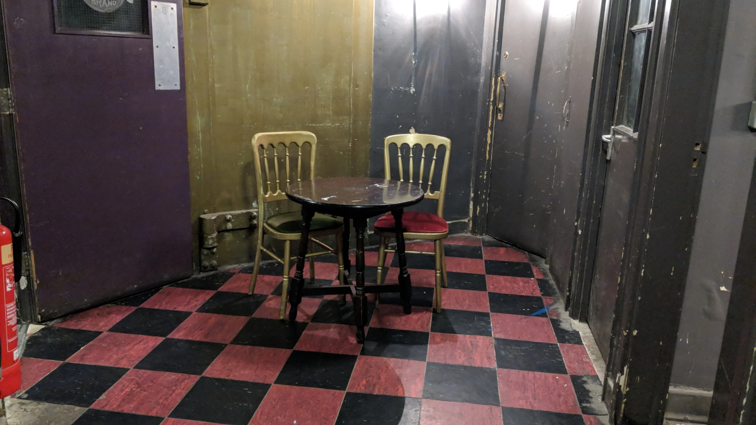 Despite the old school pub vibes of the building itself, the pub downstairs had that clean modern look that I imagine pubs in Scandinavia might have. All white walls, wooden floors, and exposed brickwork. The staircase that would lead me up to the theatre comes as a bit surprise. Red walls. Red balustrades. Photos and flyers are cramped into every available space. This is what the inside the head of a theatrically inclined serial killer must look like.